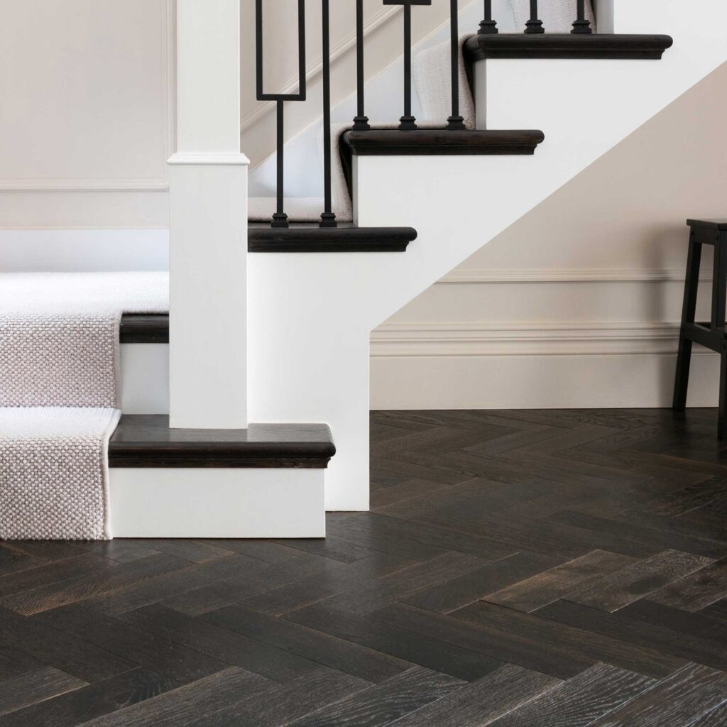 Ironworks Parquet is a unique floor range that will create an earthy and rustic aesthetic within any space. The hand applied distressing technique offers a weathered and worn appearance, adding character and charm to the surface. The traditional tools used in the burred and cross sawn process lend to the understated elegance of the overall finish. Additionally, the surface is sanded smooth before being stained with a combination of black and dark brown colour oils, which creates an unsurpassable depth of earthy hues.